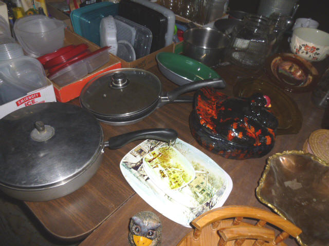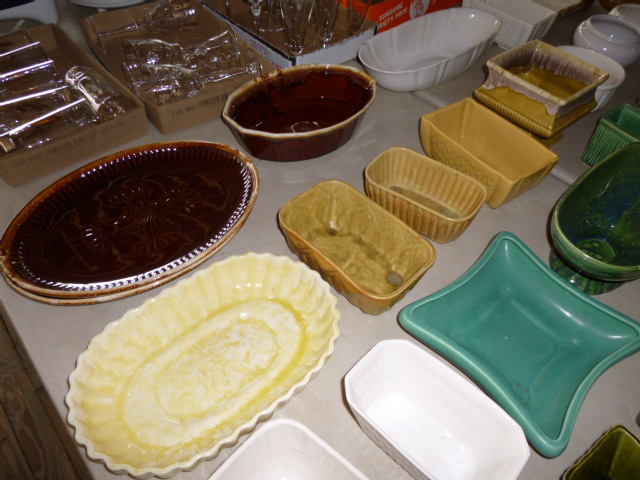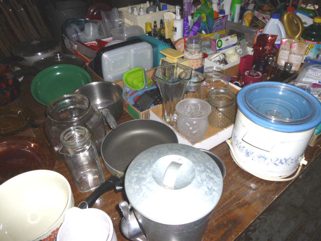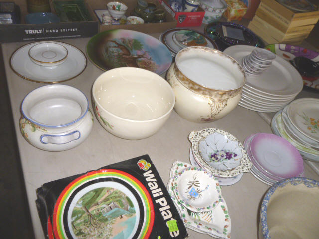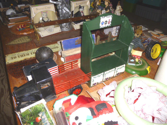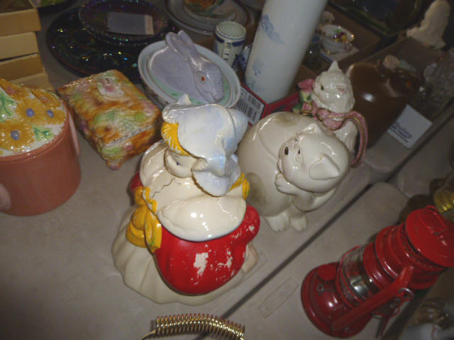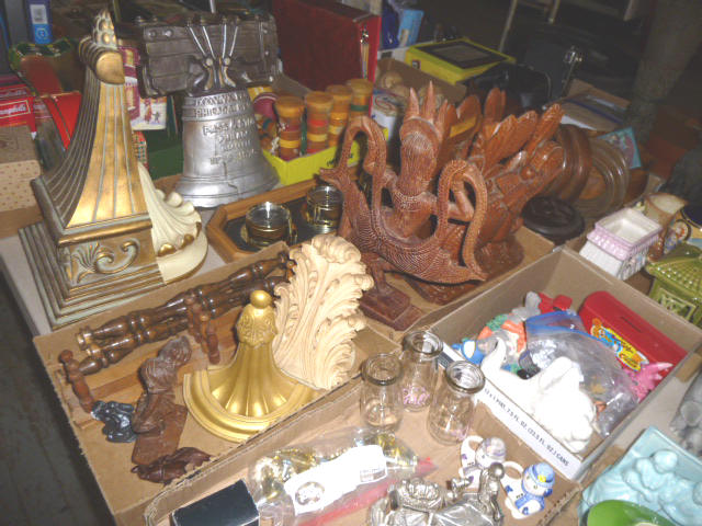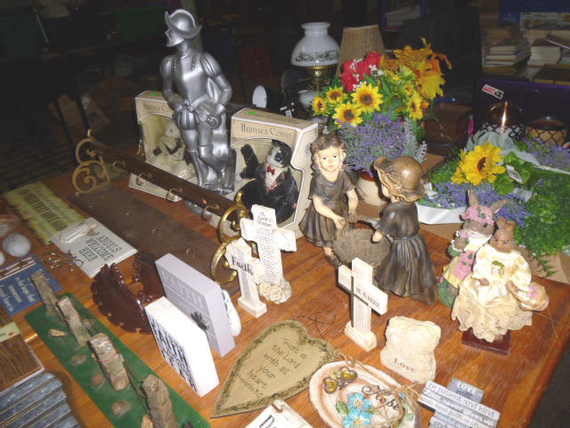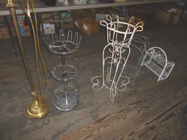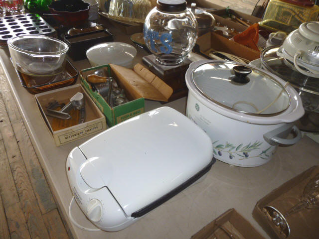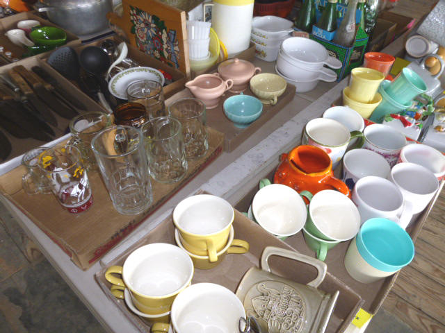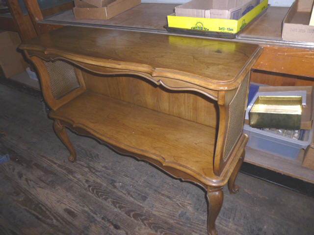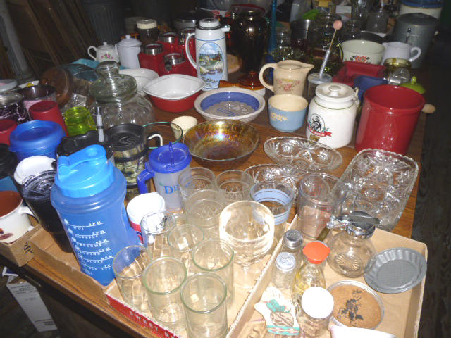 --- FURNITURE--- King Hollywood frame w/ brass headboard Queen Hollywood bed, complete Metal baker’s rack Wakefield double dresser w/ mirror Tall & narrow lighted display, mirrored back Drop-front secretary w/ hutch top (2) narrow hall tables White pressed wood shelf unit Walnut grain book shelf White wicker patio furniture 4-drawer metal file cabinet 4-drawer chest of drawers 4-drawer curved front chest of drawers --- PRIMITIVES & COLLECTABLES --- Costume Jewelry, belt buckles, trinkets Assort. McCoy vases McCoy cookie Jars Red Wing Pitcher & center piece Fire King dishes Kerosene Lamps & Lanterns Assort. Ceramic figures 45 & LP records & albums Old yard long photographs 2-gal crock butter churn Several tall metal plant stands Assort. old books |