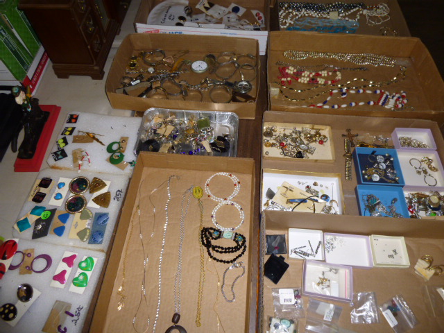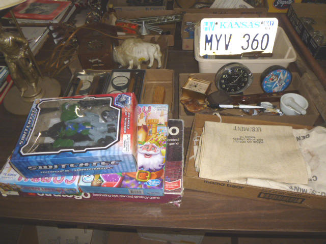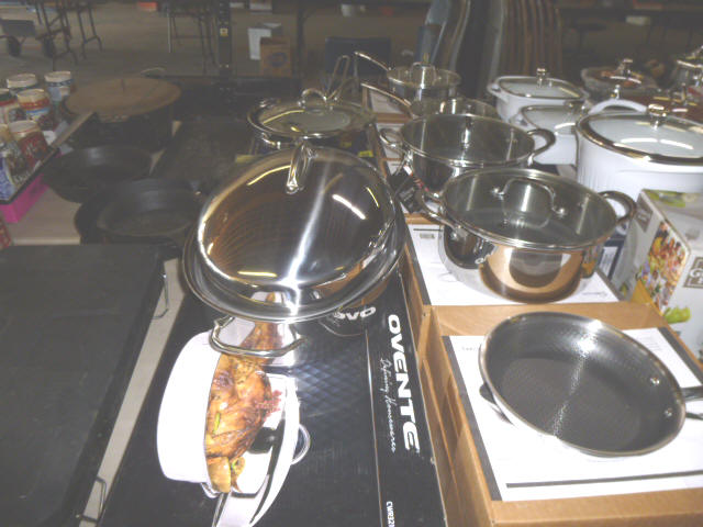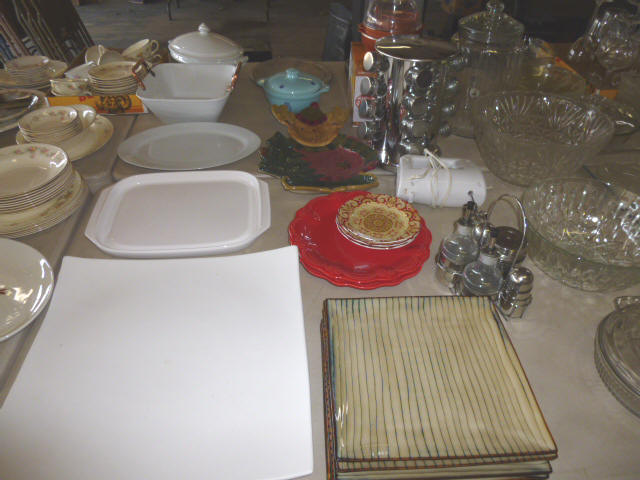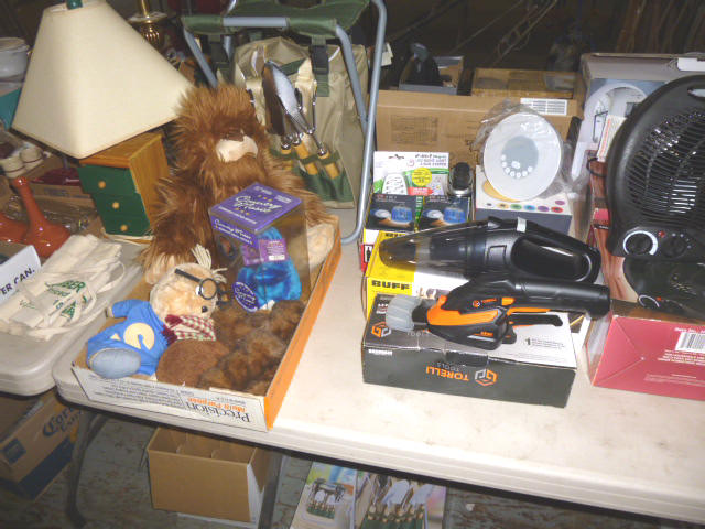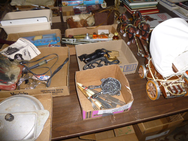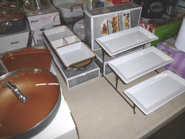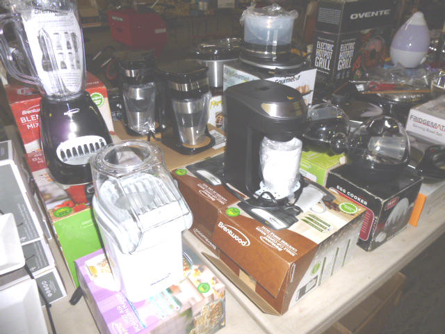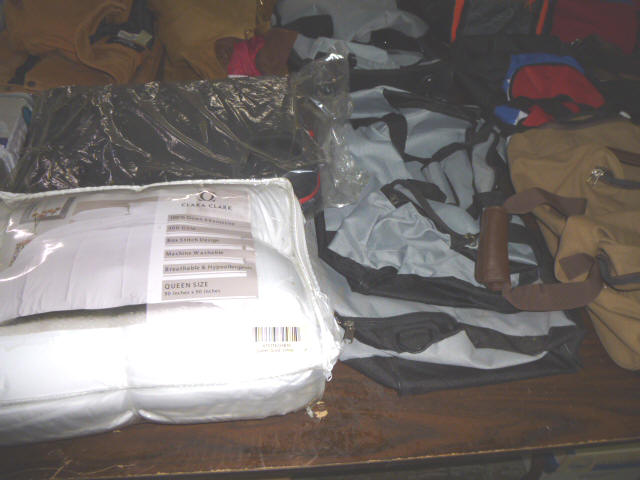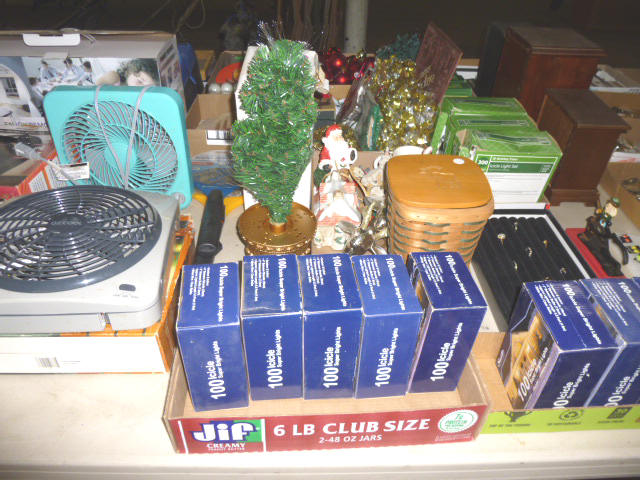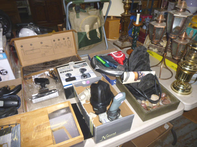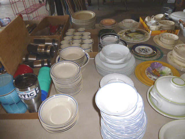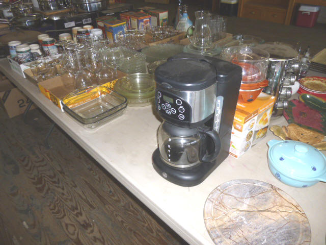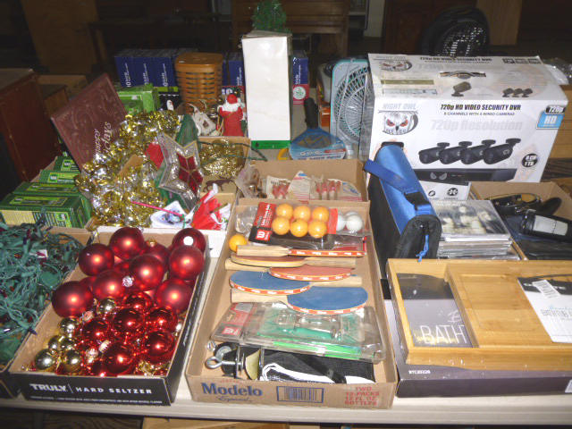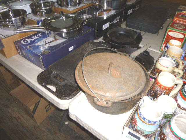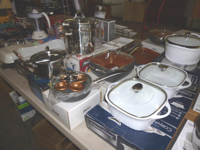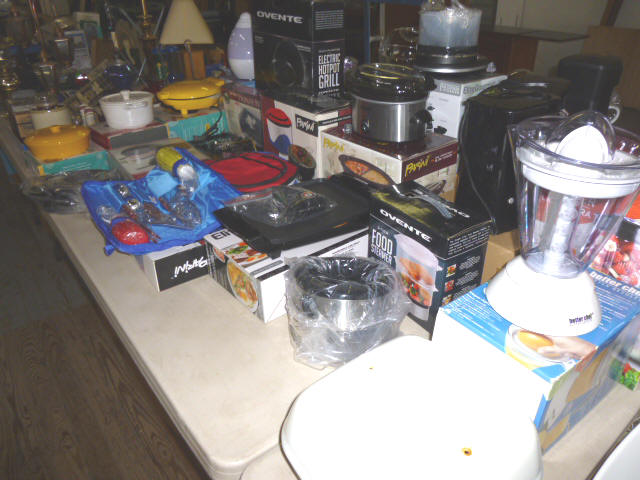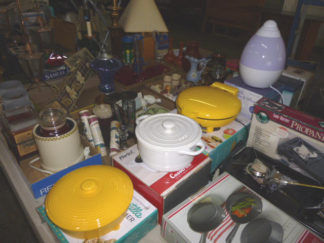 --- Full size Antique Oak bed frame Full size Antique Walnut bed frame Natural Pine bookcase cabinet Antique Armoire cabinet w/ mirror Curved front vanity dresser/ mirror Drop front 3-drawer cabinet 9-drawer enamel sewing or map cabinet Antique telephone cabinet w/ chair Barrister style 3-shelf bookcase Duncan Phyfe drop-leaf dining table Floral Print sofa chair w/ ottoman Floral print loveseat Brown cloth Swivel rocking/recliner (2) small glass top end tables Red metal display shelf Rectangle patio table w/ umbrella (2) wooden storage boxes w/ lid & tray Dry bar cabinet Wall mount Oak medicine cabinet Marble top bathroom vanity cabinet --- HOUSEHOLD --- Assort. Glassware & dishes Assort. small kitchen appliances, most NIB Table & Dresser lamps Blankets & Bed linens, most NIB Canvass bags & luggage, many NIB Large assort. “Prini” cookware, most NIB Assort. Oster cookware, NIB Assort. Corning Ware cast cookware NIB |